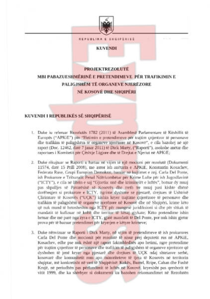 Ndërsa në tekstin e projekt rezolutës që pritet t’i propozohet ligjvënëseve shqiptarë thuhet se hetimet e thelluara rreth pohimeve të Dick Martut për trafikim organesh mbeten të paargumentuara, të paprovuara dhe të pabazuara prandaj theksohet se të tilla duhet të konsiderohen edhe nga ndërkombëtarët.