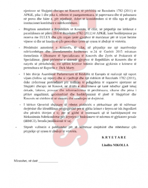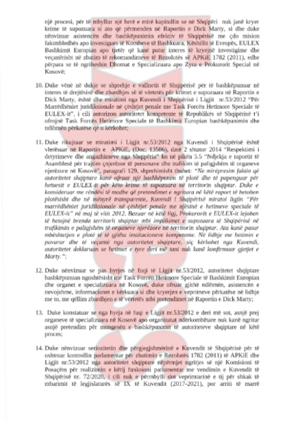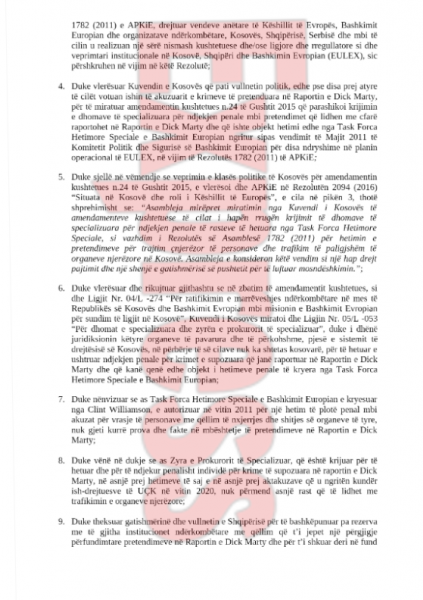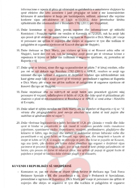 “Konstaton se, pas më shumë se dhjetë vitesh hetime të thelluara nga Task Forca Hetimore Speciale e BE dhe pasardhësja e saj, Zyra e Prokurorit të Specializuar, pretendimet e ngritura në Raportin e Dick Marty për vrasje të personave me qëllim të nxjerrjes dhe shitjes së organeve të tyre dhe trafikim të paligjshëm të organeve njerëzore në Shqipëri dhe/apo në Kosovë, të përfshira në Rezolutën 1782 (2011) të APKiE, pika 1 dhe pika 4, mbeten të paargumentuara, të paprovuara dhe të pabazuara në prova dhe fakte e, për rrjedhojë, duhet të konsiderohen si të tilla nga të gjitha institucionet kombëtare e ndërkombëtare”