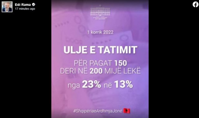 Starting from July 1, 2022, the tax on salaries will be reduced from 150 to 200 thousand ALL. The news was announced by Prime Minister Edi Rama in a Facebook post. According to the head of government, the tax will be reduced from 23 percent to 13 percent.