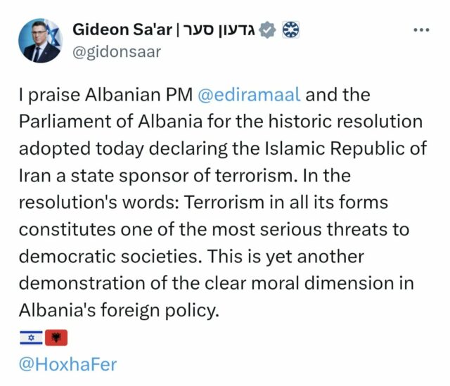 “Vlerësoj Kryeministrin e Shqipërisë, Edi Rama dhe Parlamentin e Shqipërisë për rezolutën historike të miratuar sot, që e shpall Republikën Islamike të Iranit si një shtet mbështetës të terrorizmit. Sipas fjalëve të rezolutës: Terrorizmi në të gjitha format e tij përbën një nga kërcënimet më serioze për shoqëritë demokratike. Kjo është edhe një tjetër dëshmi e dimensionit të qartë moral në politikën e jashtme të Shqipërisë”, shkruan ai.