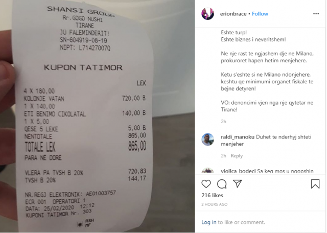 Braçe përmes një postimi në rrjetin social Instagram ka theksuar se rritja dyfish e çmimit është një turp dhe biznes i neveritshëm. Ndër të tjera në postimin e tij zëvendëskryeministri ka reaguar pas denoncimit të një qytetarri dhe ka sjellë në vëmendje se një rast i tillë i ndodhur në Milano prokurorët hapën hetim menjëherë.