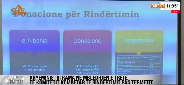 Kemi edhe 21 milion angazhime të marra nga donatorët ndërkombëtarë.  Kjo shifër e donatorëve ndërkombëtarë do të lëvizë dhe besoj do të lëvizë në mënyrë të konsiderueshme si rezultat i ndërveprimeve që ne kemi ndërmarrë dhe patjetër me kurorëzimin e konferencës së donatorëve të thirrur nga presidentja e Komisionit evropian për të gjitha vendet e BE dhe disa aktivitete të tjera në vendet e lindjes së mesme, ku jemi shumë aktivë. Mbetet për tu parë vendimi përfundimtar i organizatorëve të konferencës së donatorëve dhe në kuadër të BE nëse do të përfshihen donatorët jashtë BE apo jo, mbetet për tu parë. Shtuar këtu donacionet e mbledhura nga organizatat, të cilat besoj që kemi dakordësi, do të publikohen në të njëjtën faqe, natyrisht të ndara në mënyrë që edhe ato të kenë një raport transparence dhe koherence me donatorët e tyre, ndërkohë edhe publiku të ketë, kemi një bazë jo të vogël për të ecur me shpejtësi në fazën e ndërtimit”, tha Kryeministri./abcnews.al