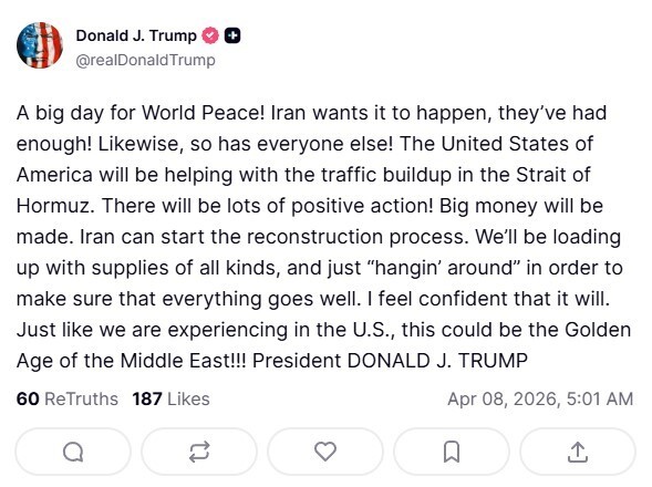 Presidenti amerikan, Donald Trump e ka cilësuar si “një ditë të madhe për paqen botërore”, armëpushimin dy javor me Iranin.