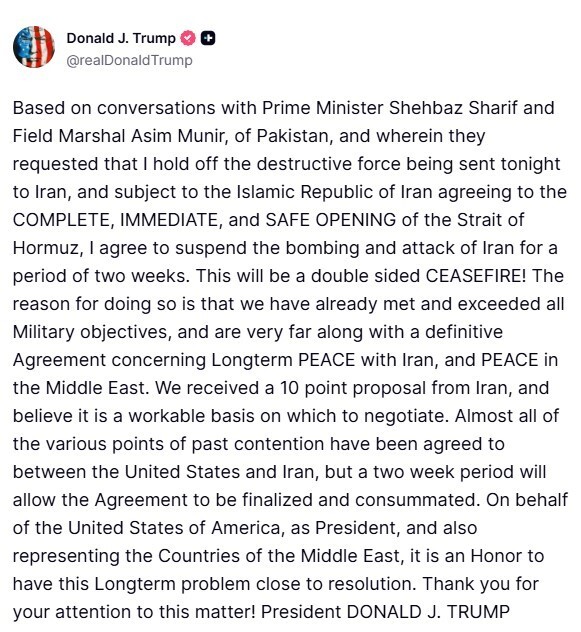 “Bazuar në bisedat me Kryeministrin Shehbaz Sharif dhe Feldmarshal Asim Munir të Pakistanit, dhe ku ata kërkuan që unë të pezulloj forcën shkatërruese që do të dërgohet sonte në Iran, dhe me kusht që Republika Islamike e Iranit të bjerë dakord për hapjen e plotë, të menjëhershme dhe të sigurtë të Ngushticës së Hormuzit, unë pajtohem të pezulloj bombardimet dhe sulmet ndaj Iranit për një periudhë prej dy javësh. Ky do të jetë një armëpushim i dyanshëm!”, postoi Trump në Truth Social. Arsyeja për ta bërë këtë është se ne tashmë i kemi përmbushur dhe tejkaluar të gjitha objektivat ushtarake dhe jemi shumë larg një marrëveshjeje përfundimtare në lidhje me paqen afatgjatë me Iranin dhe paqen në Lindjen e Mesme.