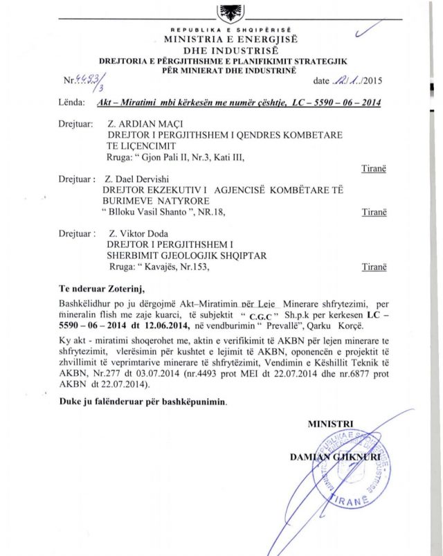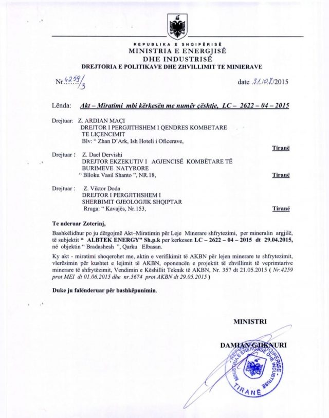 Gjithashtu Partia Demokratike ka publikuar dokumentin ku shihet se Damian Gjiknur, ish-ministër i Infrastrukturës dhe Energjitikës ka firmosur një leje minerare në Bradashesh me kohëzgjatje mbi 25 vite i është dhënë shoqërisë Albtek Energy.
