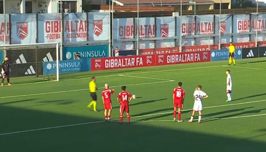 Penallltia u akodrua nga arbitri, pasi një lojtar i Gjibraltarit preku topin me dorë brenda zonës./abcnews.al
