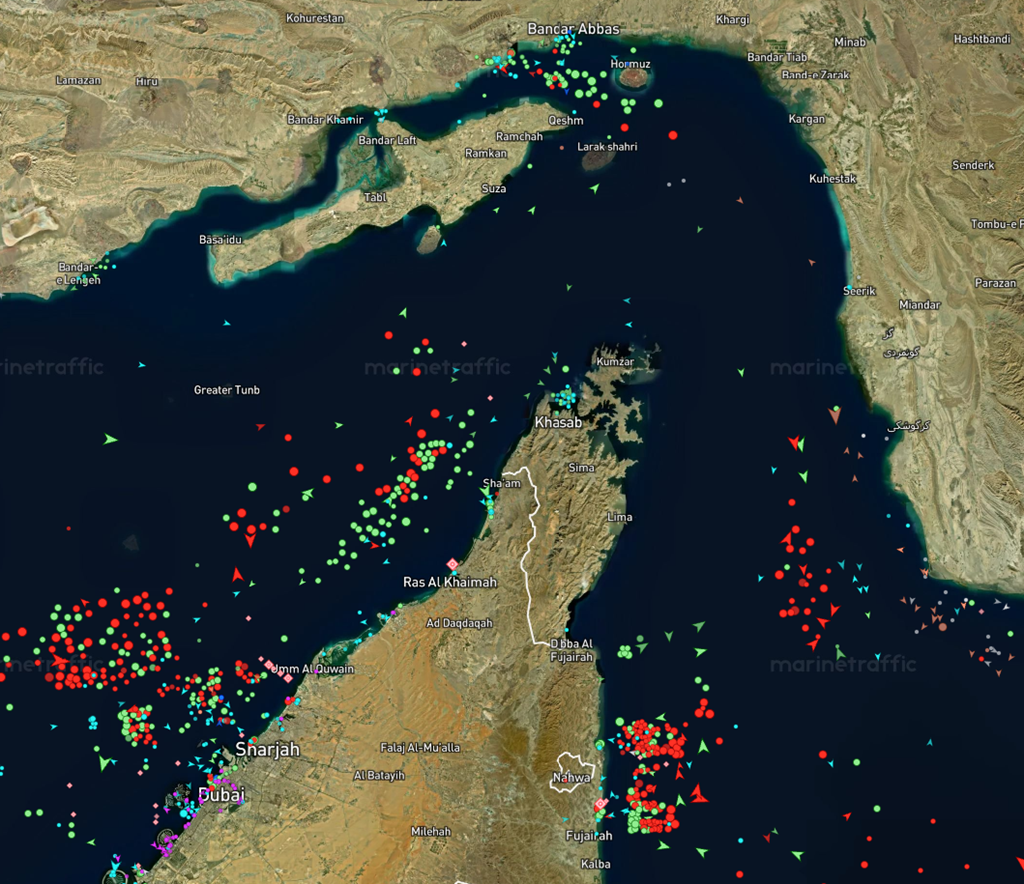 Pamjet e fundit satelitore nga platforma e gjurmimit të anijeve MarineTraffic tregojnë ngushticën kryesisht të shkretë.