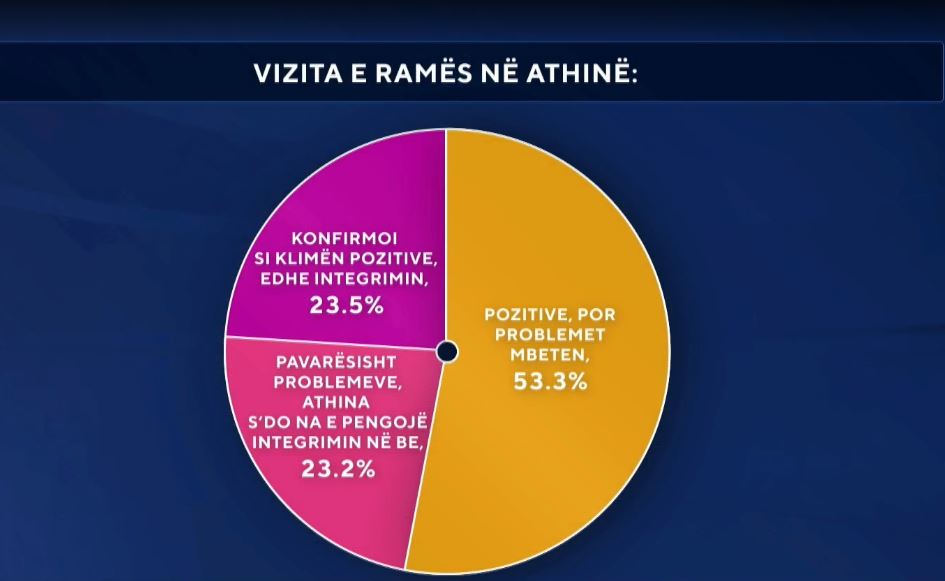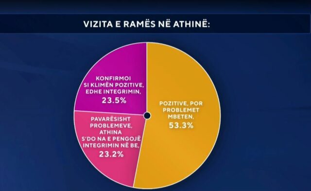 53.3% e qytetareve te anketuar thone se problemet mes Shqiperise e Greqise mbeten. 23.2% te tjere po ashtu jane pesimiste per problemet, por optimiste se Greqia nuk do e pengoje Shqiperine ne integrimin ne BE. 23.5% jane optimiste per te dyja, si per zgjidhjen e plote te problemeve te mbartura edhe per mbeshtetjen qe Greqia do i jape Shqiperise ne rrugetimin drejt BE. /abcnews.al /