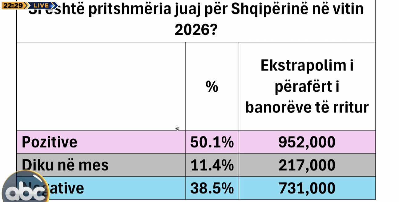 Pritshmëri negative për vendin gjatë 2026 kanë 38.5% ose në një ekstrapolim të shifrave 731,000. Ndërsa të dyzuar janë rreth 217,000 shqiptarë.
