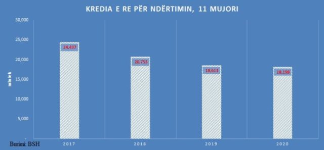 Të dhëna të tjera të Bankës së Shqipërisë tregojnë se ky bum i ndërtimeve nuk po financohet me kredi bankare. Huaja e re për sektorin e ndërtimit ka ardhur në rënie që prej vitit 2017. Në 2019-n, kredia e re e dhënë për ndërtimin (11 mujori) ishte rreth 24% më e ulët se në 2017-n, sipas të dhënave zyrtare dhe në të njëjtat nivele ishte dhe për 11 mujorin 2020. (shih grafikun Kredia e re për ndërtimin, 11 mujori).