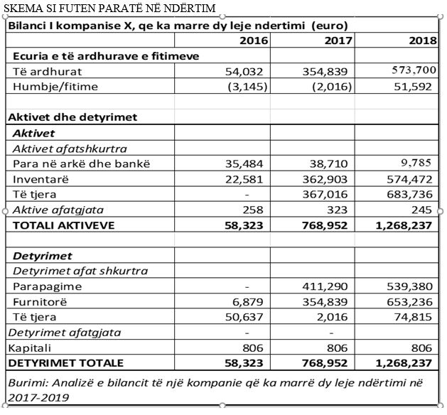 Kompania X ka marrë një leje ndërtimi në vitin 2017. Këtë vit, subjekti kishte dorëzuar vetëm bilancin e 2016-s. Nga bilanci zyrtar rezulton se të ardhurat e saj ishin vetëm 54 mijë euro, që janë të pamjaftueshme për të blerë një apartament dhe jo më për të filluar ndërtimin e një pallati. Kompania kishte një humbje minimale prej rreth 3 mijë eurosh. Po në vitin 2016, kompania kishte asete gjithsej prej 58 mijë eurosh, nga të cilat 35 mijë euro ishin para në bankë ose arkë. Në kahun tjetër, subjekti kishte detyrime prej 50 mijë eurosh ndaj të tretëve, ndërsa nuk kishte kredi në banka.