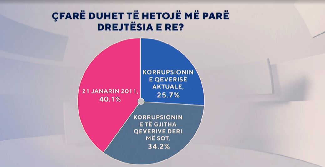 Pyetjes së drejtuar nga sondazhisti Eduard Zaloshnja, se Çfarë duhet të hetojë më parë Drejtësia e Re? 40.1% janë shprehur për 21 janarin, 34.2% korrupsionin e të gjitha qeverive deri më sot, dhe 25.7% korrupsionin e qeverisë aktuale.