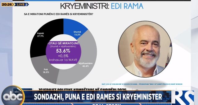 53.6 përqind e të pyeturve, e vlerësojnë Edi Ramën si kryeministër. Ky vlerësim, është rritur me 0.5 përqind krahasuar me sondazhin e parë./abcnews.al