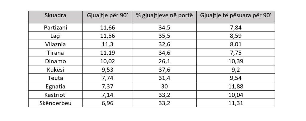 Kjo shpjegohet me përqindjen e ulët të goditjeve që arrijnë të futen në pasqyrën e portës. 26% e goditjeve në portë nga numri i përgjithshëm i goditjeve të tentuara gjithashtu ul ndjeshëm mesataren e gjuajtjeve në portë të të gjithë kampionatit.