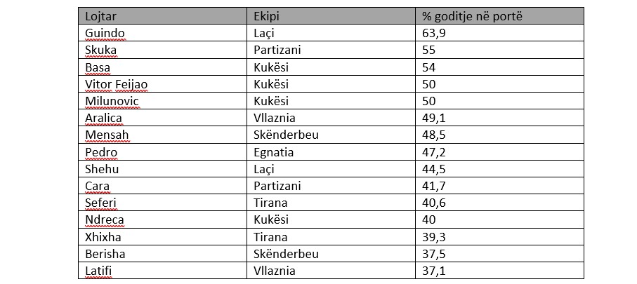 Përveç këtyre të dhënave që kanë të bëjnë me goditjet në portë, është gjithashtu e rëndësishme të vlerësohet se cilët janë 15 lojtarët të cilët kanë përqindje më të lartë të goditjeve në portë krahasuar me numrin e goditjeve të tentuara. Prania e të njëjtit lojtar në të dyja renditjet do të thotë, që përveçse godet shumë portën, lojtari arrin të jetë efektiv edhe kur gjuan.