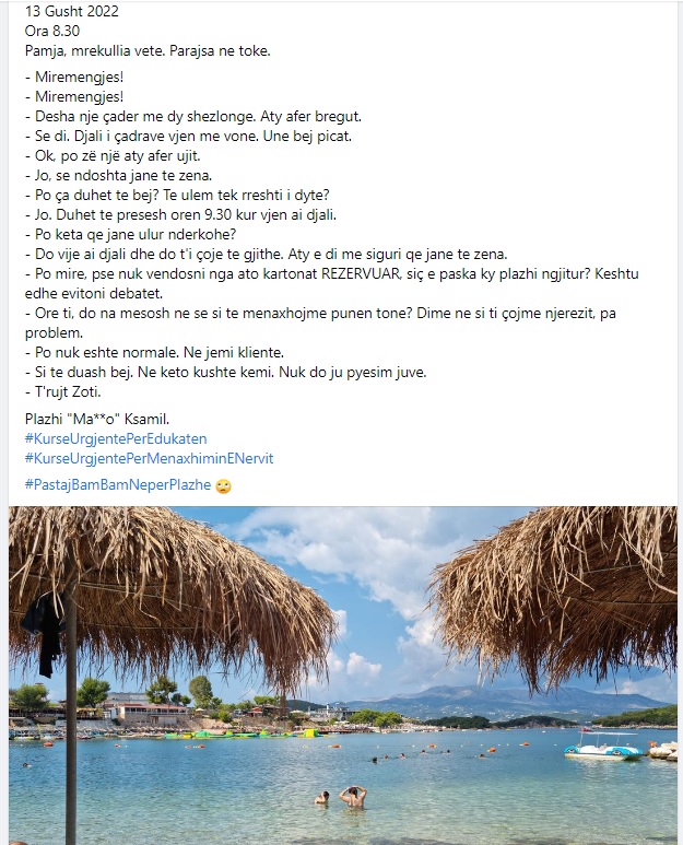 Një qytetar ka postuar sëfundmi në rrjetet sociale eksperiencën e tij të keqe në plazhin “Mango” në Ksamil, ku jo vetëm që nuk dhanë asnjë shpjegim se ku të rrinte, por në fund, të bezdisur nga pyetjet e pushuesit i thanë edhe “ik po deshe”.