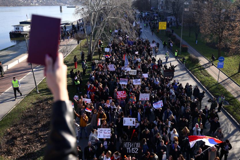 Studentët e grupuar kanë mbajtur parulla me moton ‘Takohemi në Sretenjë’ dhe do të vijojnë 15 orë bllokadën në simbolikë me 15 viktimat pas shembjes së çatisë në stacionin e trenit në Novi Sad.