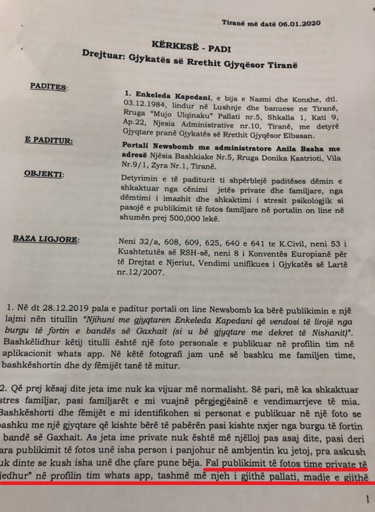 Me këtë argument, Kapedani kërkon nga neësbomb.al një dëmshpërblim prej 5 milion lekësh duke përdorur si precedent “Von Hannover’ kundër Gjermanisë ku GJEDNJ ka specifikuar që ‘fotografitë e botuara nëpër revista e gazeta mund të përmbajnë të dhëna tepër personale dhe madje intime në lidhje me një person’.