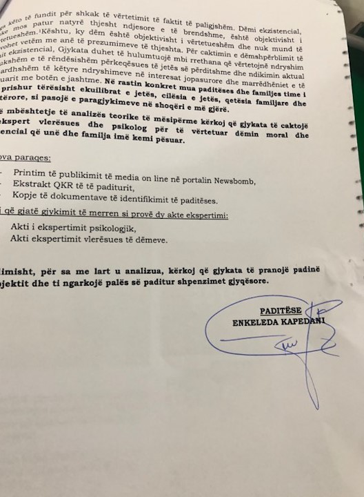 “Që prej asaj dite jeta ime nuk ka vijuar më normalisht. Së pari më ka shkaktuar stres familjar, pasi familjarët e mi vuajnë përgjegjësinë e vendimarrjeve të mia. Bashkëshorti dhe fëmijët e mi, identifikohen si personat e publikuar në një foto së bashku me një gjyqtare që kishte bërë të pabërën pasi kishte nxjerrë nga burgu të fortin e bandës së Gaxhait. Deri para publikimit të fotos, unë isha person i panjohur në ambientin ku jetoj pasi askush nuk dinte se kush isha unë dhe çfarë pune bëja, Falë publikimit të fotos time private të vjedhur në profilin tim, tashmë më njeh i gjithë pallati, madje e gjithë lagjia”, thuhet në padinë e gjyqtares.