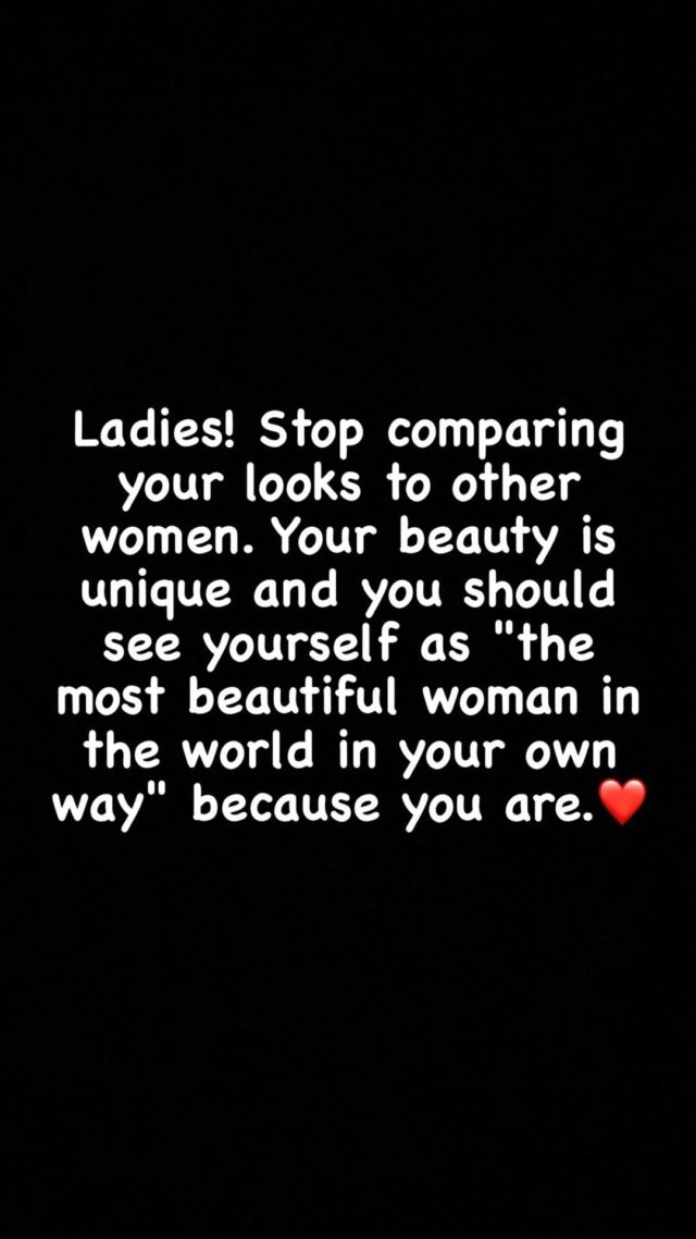 Tayna ka ndarë një mesazh të rëndësishëm për gratë dhe vajzat. Përmes një postimi në Instastory, reperja shkruan “Mos e krahasoni pamjen tuaj me gratë e tjera. Bukuria jote është unike dhe duket ta shikosh veten si gruan më të bukur në botë në mënyrën tënde, sepse ti je”.