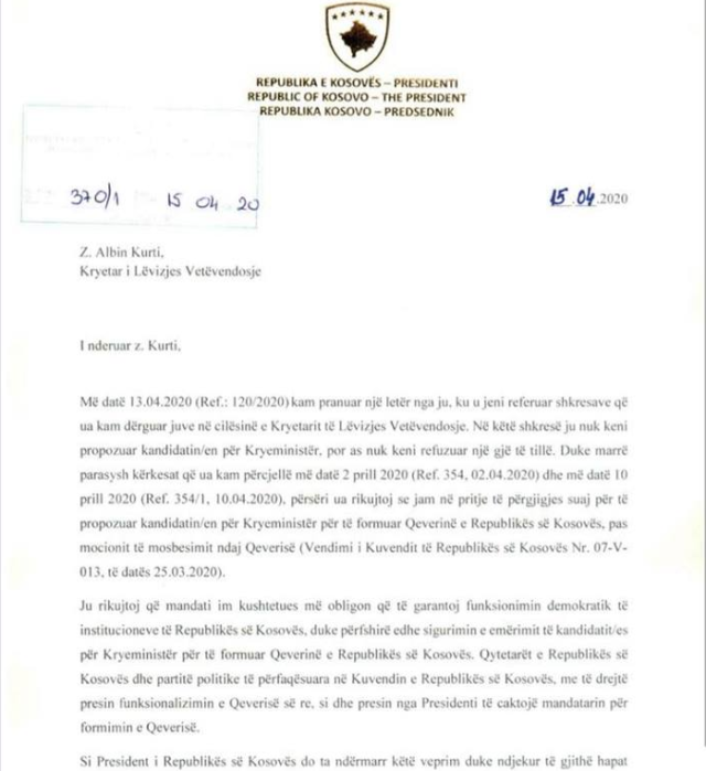 Është letra e tretë që kreu i shtetit i ka drektuar kryetarit të Vetëvendosjes Kurtit, duke i kërkuar sërish që ta propozojë kandidatin e ri për kryeministër për ta formuar Qeverinë e re, pas mocionit të mosbesimit ndaj Qeverisë së tij.