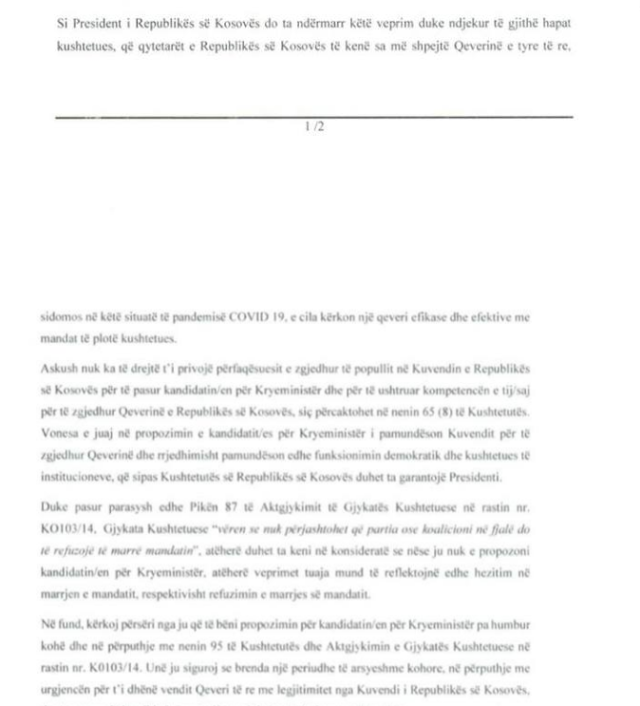 “.. Do të ndërmarr këtë veprim duke ndjekur të gjithë hapat kushtetues që qytetarët e Republikës së Kosovës të kenë sa më shpejtë qeverinë e tyre të re, sidomos në këtë situatë të pandemisë e cila kërkon një qeveri efikase dhe efektive me mandat të plotë kushtetutës”, shkruan presidenti./abcnews.al