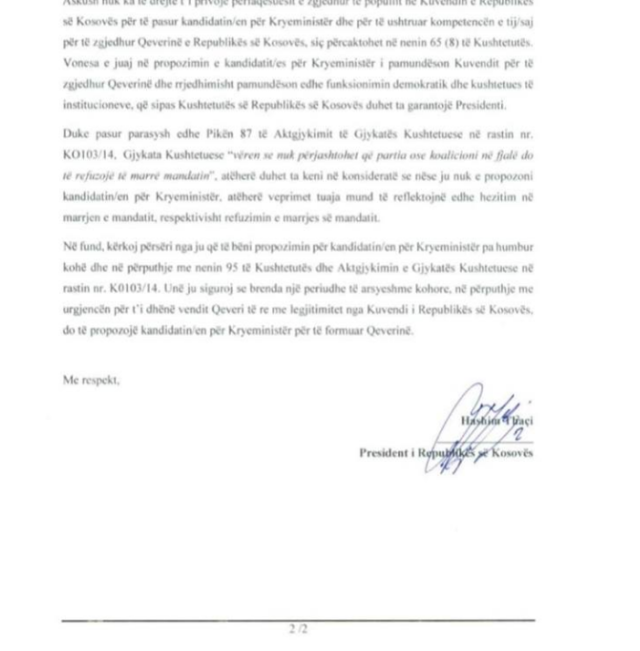 Në letrën e tij Thaçi tregon se është në pritje të emrit të kandidatit për kryeministër. Gjithahstu ai ka sqaruar se në lidhje me këtë çështje ai do të ndjekë të gjithë hapat kushtetutës, që sa më shpejtë të krijohet qeveria e re.
