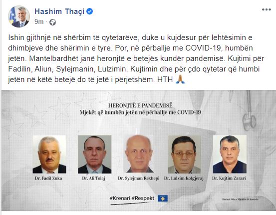“Ishin gjithnjë në shërbim të qytetarëve, duke u kujdesur për lehtësimin e dhimbjeve dhe shërimin e tyre. Por, në përballje me COVID-19, humbën jetën. Mantelbardhët janë heronjtë e betejës kundër pandemisë. Kujtimi për Fadilin, Aliun, Sylejmanin, Lulzimin, Kujtimin dhe për çdo qytetar që humbi jetën në këtë betejë do të jetë i përjetshëm”, shkruan Thaçi.