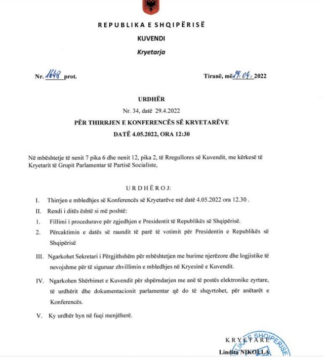 The Conference of Presidents on the issue of electing a new president will convene on May 4. The Conference of Speakers is convened at the request of the Chairman of the SP Group, Taulant Balla and is chaired by the Speaker of the Assembly, Lindita Nikolla.