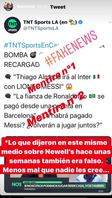 Messi i ka mohuar të dyja, duke i cilësuar si lajme false dhe gënjeshtra. “Edhe ajo që ata thanë në të njëjtën gazetë disa javë më pare, për kalimin te Newell’s Old Boys, ishte e pavërtetë. Për fat të mire, askush nuk i beson”, shkruan Messi. /abcnews.al