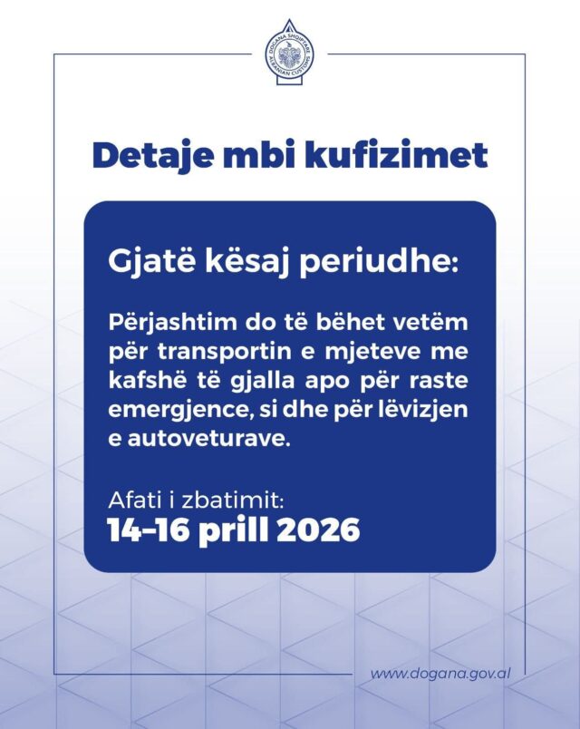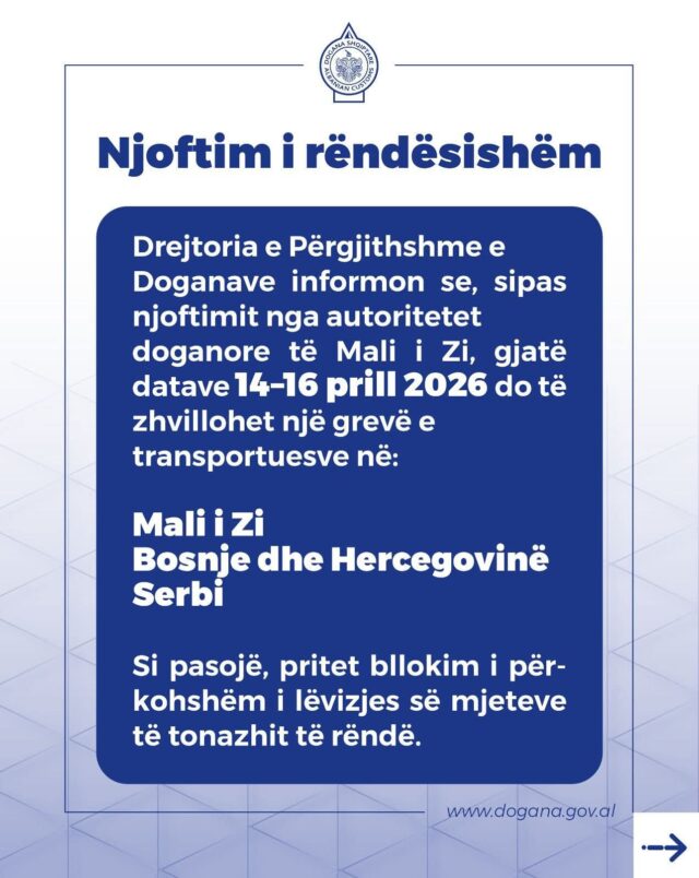 Në Mal të Zi, Bosnjë e Hercegovinë dhe Serbi është njoftuar se do të zhvillohet grevë e transportuesve. Si pasojë pritet bllokim i lëvizjes së mjeteve të tonazhit të rëndë. Dogana Shqiptare sqaron se përjashtim do të kenë vetëm mjetet e lëvizjes së emergjencës dhe mjeteve me kafshë.