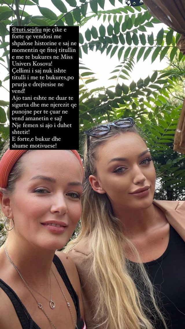 “Tuti Sejdiu, një çikë e fortë që vendosi me shpalosë historinë e saj në momentin që fitoi titullin e më të bukurës në ‘Miss Universe Kosova’! Qëllimi i saj nuk ishte titulli i më të bukurës, po prurja e drejtësisë në vend!