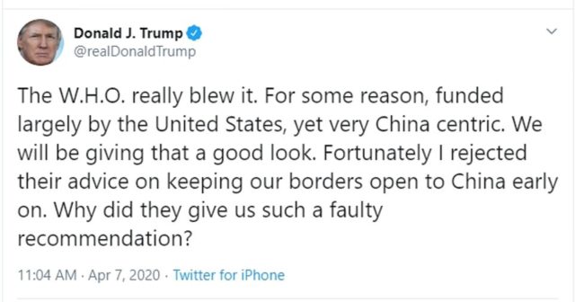 Ankesa kryesore e Trump me grupin e shëndetit të Kombeve të Bashkuara është se ata thanë se nuk ishte e nevojshme të ndalonin udhëtarët që vinin nga Kina pasi koronavirusi filloi të përhapet përtej Wuhanit, nga ku filloi.