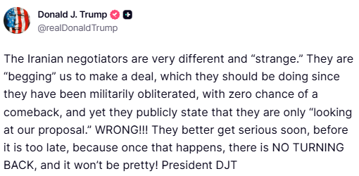“Negociatorët iranianë janë shumë të ndryshëm dhe “të çuditshëm”. Ata po na “luten” të bëjmë një marrëveshje, gjë që duhet ta bëjnë meqenëse janë zhdukur ushtarakisht, me zero shanse për një rikthim, megjithatë ata deklarojnë publikisht se po “shqyrtojnë vetëm propozimin tonë”. Gabime!!! Më mirë të bëhen seriozë sa më shpejt, para se të jetë tepër vonë, sepse sapo të ndodhë kjo, nuk ka kthim, dhe nuk do të jetë mirë!”, shkruan Trump në Truth Social./abcnews.al