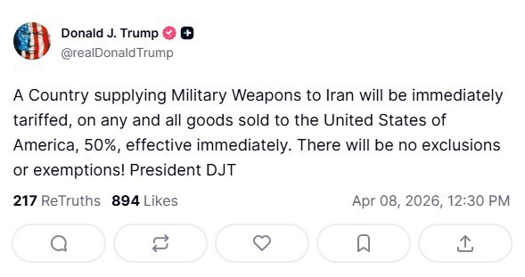 “Çdo vend që furnizon Iranin me armë do të përballet menjëherë me tarifa doganore 50 përqind për të gjitha mallrat që shet në Shtetet e Bashkuara, me efekt të menjëhershëm”.