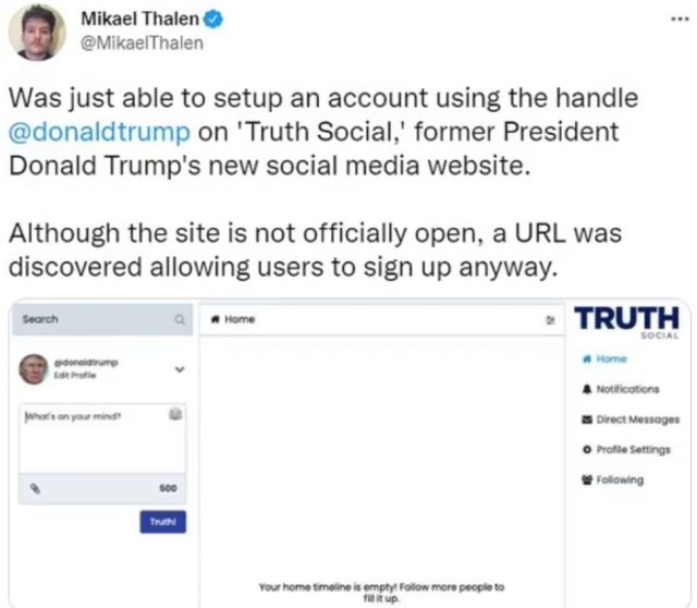Por, accounti tij është hakuar, brenda dy orëve pasi Donald Trump njoftoi krijimin e mediumit të rrjeteve sociale, i cili do të publikohet në fillim të vitit 2022.  Drew Harwell, gazetar mbi aspektet teknologjike të «Washington Post», tha se një llogari me emrin «donaldjtrump» në «Truth Social» ishte sulmuar tashmë nga hakerat. Sidoqoftë, mbetet e panjohur nëse llogaria i përket në fakt Trump.