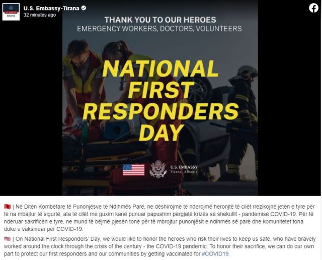 Today, on the International Day of First Aid Workers, the US Embassy in Albania has appealed for vaccination against COVID.