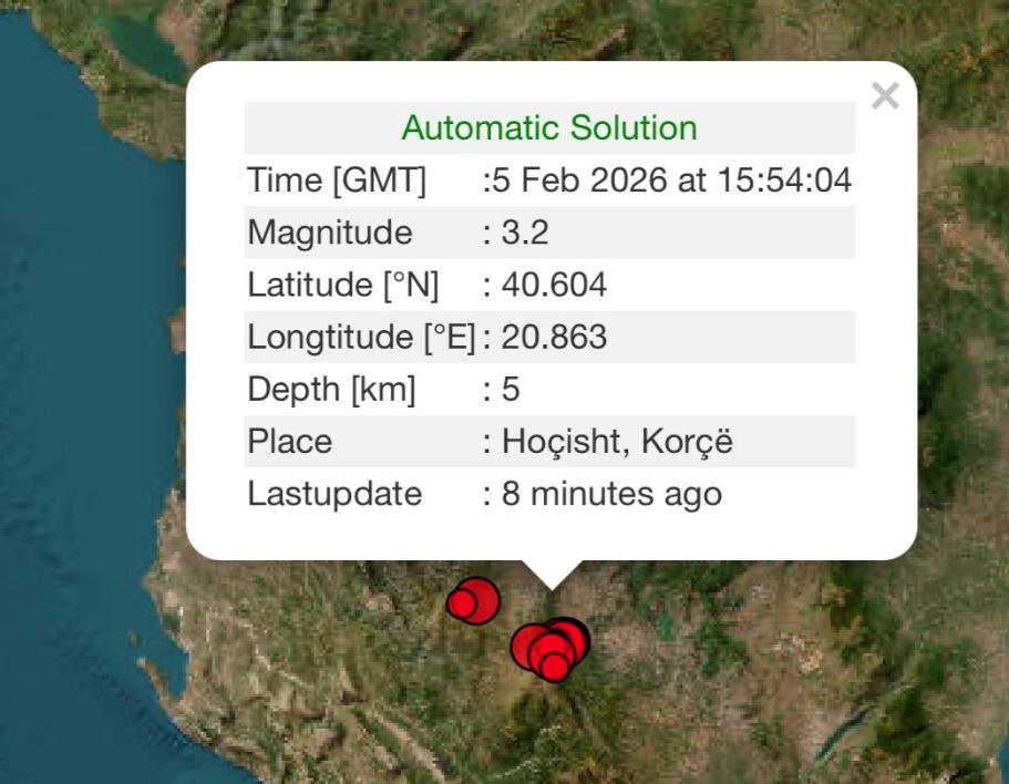 Vazhdojnë lëkundjet e tërmetit në juglindje të Shqipërisë. Tërmeti i fundit është regjistruar pak minuta më parë me magnitudë 3.2 të shkallës Rihter, me epiqendër në fshatin Hoçisht, në bashkinë Devoll.