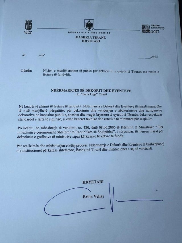 Në dokumentin që mban firmën e tij i kërkohet Ndërmarrjes së Dekorit dhe Eventeve të nisë përgatitjet që Tirana të jetë gati për të pritur festat e fundvitit.