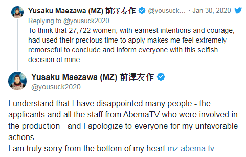 Në postimet e tij, Maezawa shprehu keqardhje të jashtëzakonshme: