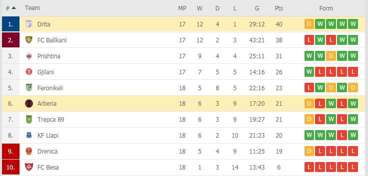 Pas javës së 18 Drita udhëheq me 40 pikë, e ndjekur nga Ballkani me dy pikë më pak. Arbëria dhe Trepça renditen në vendet 6 dhe 7 me nga 21 pikë, ndërsa Drenica e Bledar Devollit qëndron në zonën e ftohtë, saktësisht në vendin e nëntë me 19 pikë. /abcnews.al