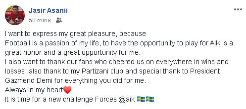 Përmes një postimi në rrjetet sociale, Asani ka edhe një mesazh për tifozët e kuq: “Dua të shpreh kënaqësinë e madhe, pasi futbolli është pasioni i jetës sime, që kam mundësinë të luaj për AIK. Është një nder dhe mundësi e madhe për mua.