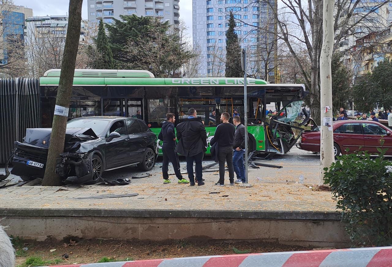 Një autobus i linjës së Unazës në Tiranë është përplasur me disa mjete.
