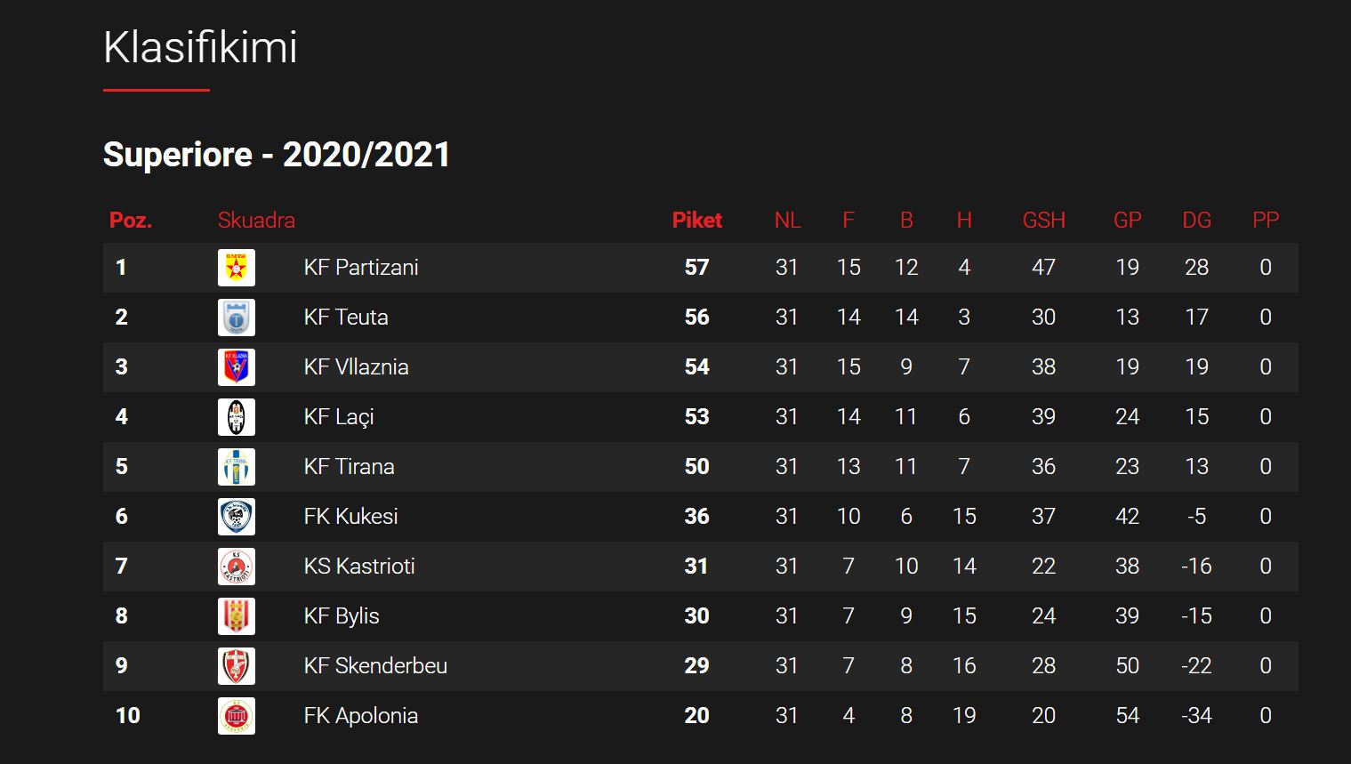 PARTIZANI: Hoxha, Mala, Bitri, Belica, Hakaj, Broja (Kote 66′), Murataj (Hasani 66′), Bardhi, Asani (Cara 85′), Çinari, Stenio Junior (Cardoso 85′). Trajner: Ilir Daja.