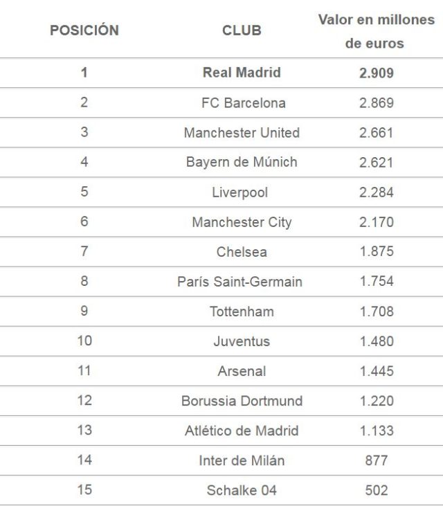 Real Madrid ruajti pozicionin si klubi më i shtrenjtë i Evropës për të tretin vit radhazi, përpara Barcelonës dhe Manchester United. Gjithsesi, të tre klubet ranë nën 3 miliard euro, shumë që u tejkalua në vitin e kaluar. Më pas Bayern Munchen dhe Liverpool.