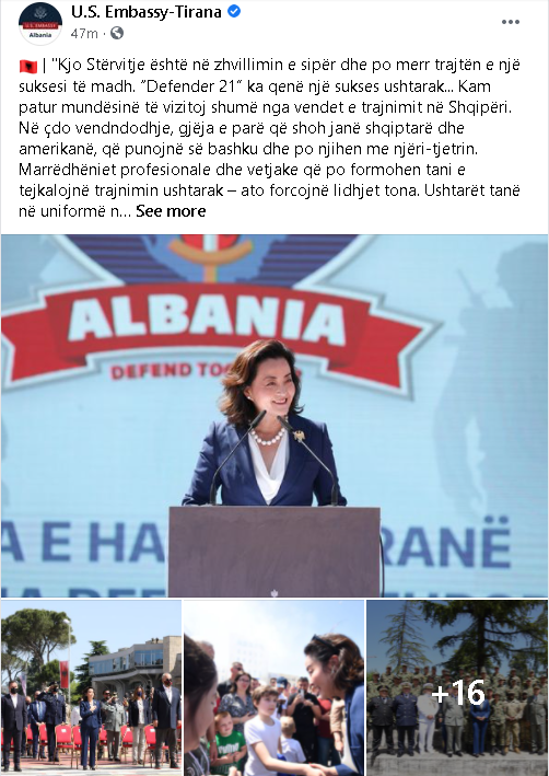 Gatishmëria, aftësitë dhe ndërveprueshmëria jonë garantojnë parandalimin e konfliktit, ruajtjen e paqes dhe mbajtjen e kombeve tona të sigurta. Për më tepër, “Defender 21” ka hedhur bazat për një bashkëpunim edhe më të fortë në vitet në vazhdim. Kam patur mundësinë të vizitoj shumë nga vendet e trajnimit në Shqipëri. Në çdo vendndodhje, gjëja e parë që shoh është shqiptarë dhe amerikanë, që punojnë së bashku dhe që po njihen me njëri-tjetrin. Marrëdhëniet profesionale dhe vetjake që po formohen tani e tejkalojnë trajnimin ushtarak – ato forcojnë lidhjet tona. Ushtarët tanë në uniformë ndihen saktësisht sikurse ndihemi ne diplomatët, të veshur me kostume, për këtë vend: Ata mrekullohen me bukurinë e Shqipërisë, vlerësojnë mikpritjen e ngrohtë të popullit shqiptar dhe janë krenarë që Shtetet e Bashkuara e quajnë Shqipërinë një mik dhe Aleat. Si miq dhe aleatë, ushtarët amerikanë dhe shqiptarë kanë qenë në krah të njëri-tjetrit në konflikte të shumta, nga Kosova në Afganistan, në Irak dhe më gjerë. Dhe e dimë nga ato përvoja që Amerika ka një mike të vërtetë dhe të guximshme tek Shqipëria.