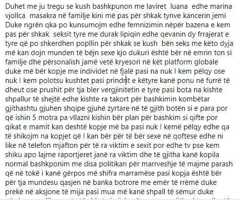 “Duhet me ju trego kush bashkëpunon me Luana dhe Marina masakra keni për të pasur në familje. Kemi me pas për shkak tyre kancer jemi”, shkruan ai ndër të tjera.
