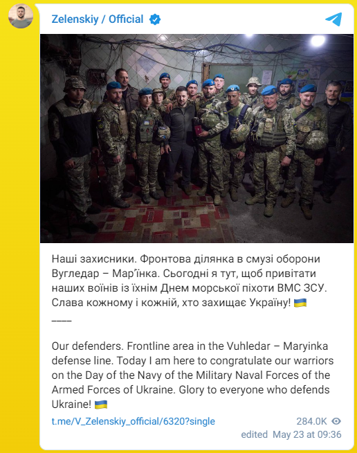 “Me mbrojtësit tanë në vijnë e parë të luftës. Sot jam këtu për të uruar luftëtarët tanë për Ditën e Marinsave të Ukrainës,” shkroi ai në Telegram.