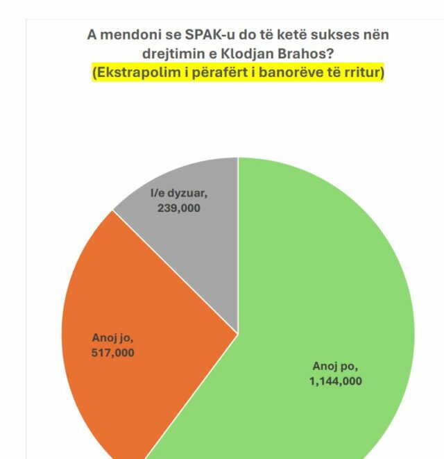 Ndërsa shifrat e sondazhit të ekstrapoluara në mënyrë të përafërt me banorë të rritur, tregojnë se 1,144,000 shqiptarë kanë mendim se SPAK do ketë sukses nën drejtimin e Klodian Brahos.
