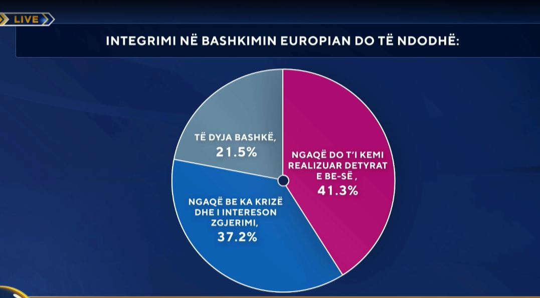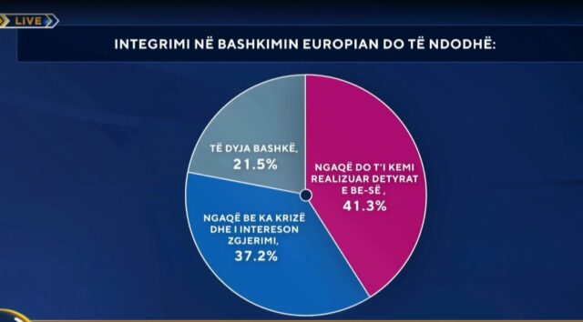 Ndërsa 37% thonë se për shkak të krizës në BE, do të përfitojë Shqipëria përmes zgjerimit. Dhe 21.5%, janë përgjigjur të dyja bashkë.